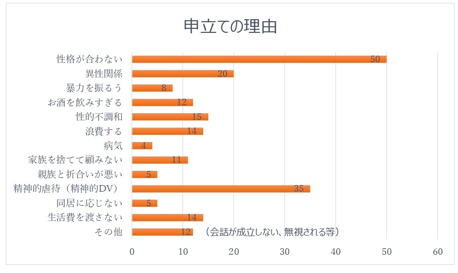 考察:家裁の離婚調停の司法統計に比べ、異性関係や暴力、生活費を渡さないといった割合が低く、精神的虐待の割合がやや高くなっています。暴力や不貞といった決定的な離婚理由はないけれど、いわゆるモラハラを理由とする申立てが多いと思われます。