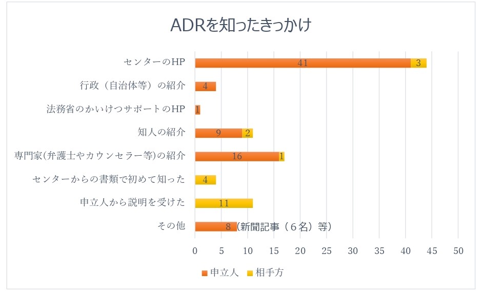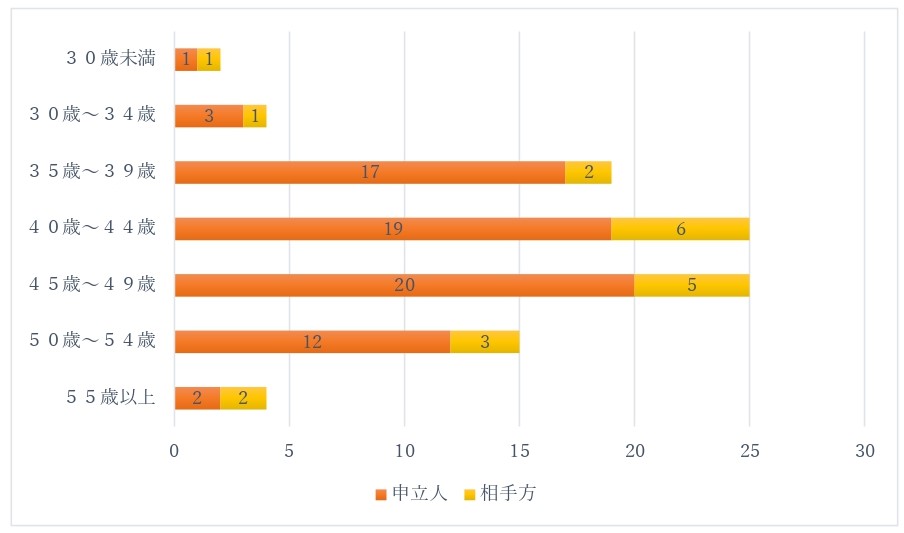 考察:家裁の離婚調停に比べ、35歳~49歳の層に利用者が集中しています。若年層にはADRの制度は浸透度が低く、比較的高齢者層にはODR等の利用はハードルが高いことが懸念されます。