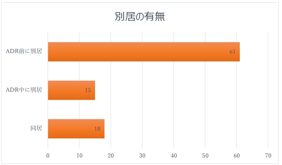 考察:家裁の離婚調停利用者より同居率が高いので、紛争性が低いと言えそうです。もしくは、別居のための話合いが行われるケースが多いとも思われます。