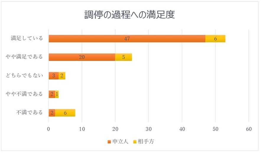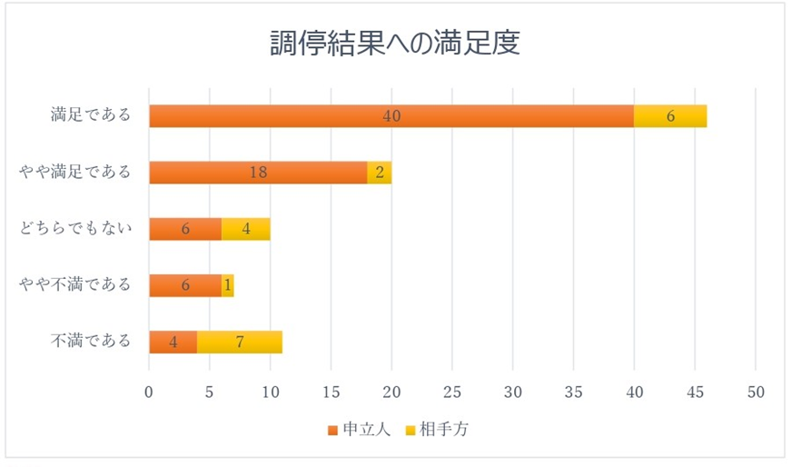 考察:申立人は大多数が「満足」もしくは「やや満足」と回答していますが、相手方は「満足」と「不満」の回答が同数です。申し立てられた立場であることに加え、制度への理解が進んでいない状況で協議が開始している可能性も考えられます。