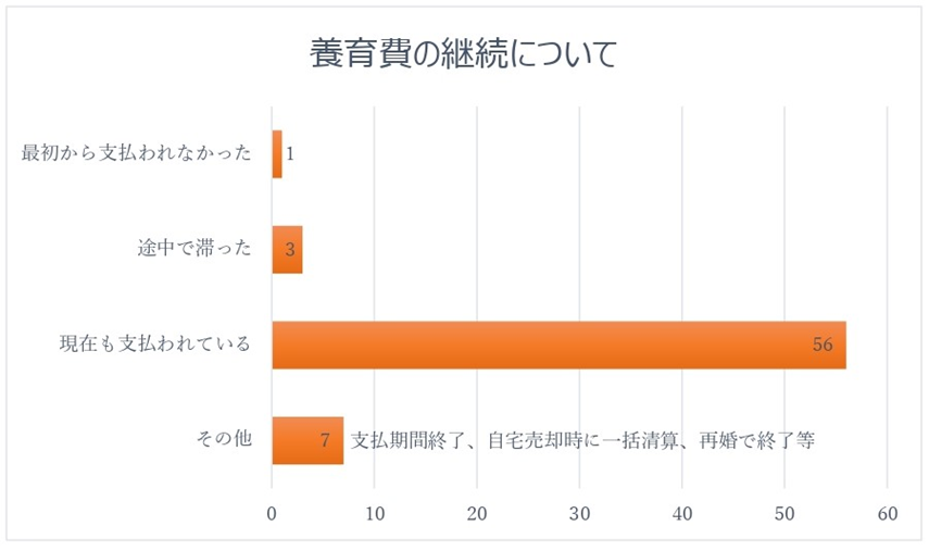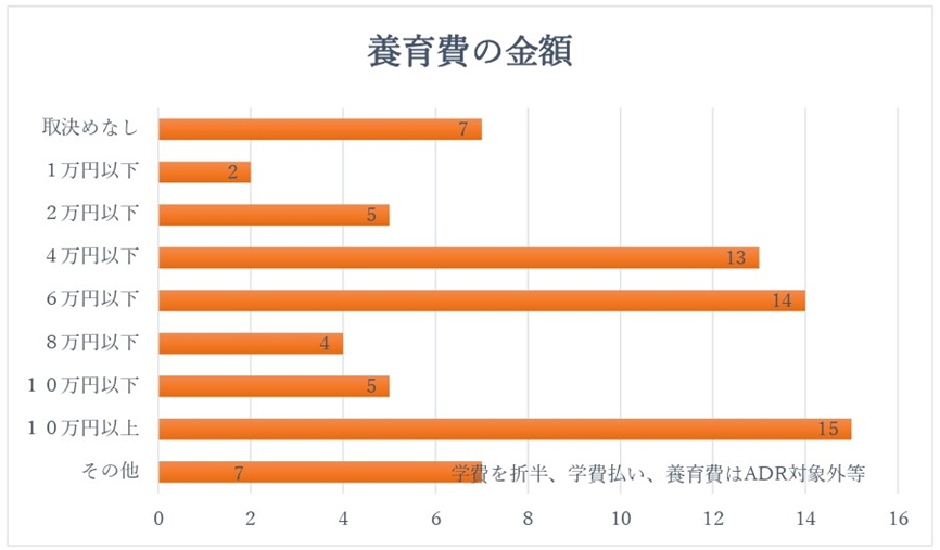 考察:10万円以上の割合が一番高く、平成28年度の厚労省が実施した調査や家裁の司法統計の金額よりあきらかに養育費が高額になっています。やはり、ADRの利用料が負担となって所得が低い人が利用できていないことが予想されます。この点においては、国や自治体の利用料助成が待たれます。