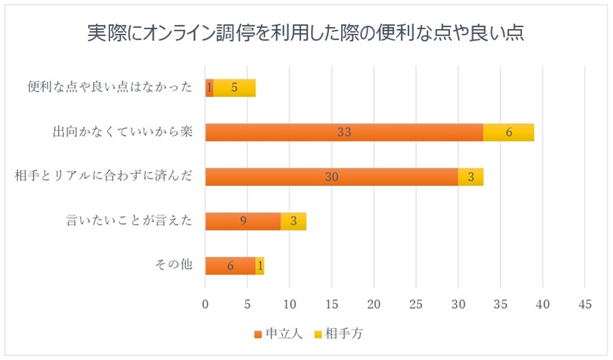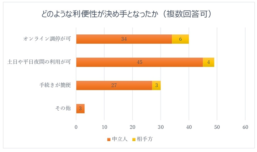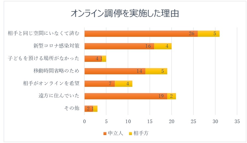 考察:新型コロナ対策や利便性といった理由ではなく、相手と同じ空間にいなくて済むという理由が一番多く、同席調停を望みつつも、空間は共有したくないという心情が読み取れます。