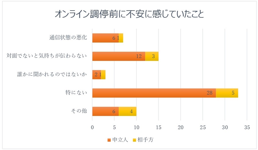 オンライン調停は、利便性が高いものの、相手と別空間で話し合うため、相手の感情が読み取りにくいのではないか、また、通信状態やセキュリティは大丈夫かといった不安の声が聞かれます。ですので、オンライン調停は対面調停に比べて満足度や成立率が低いのではないかとも考えられます。