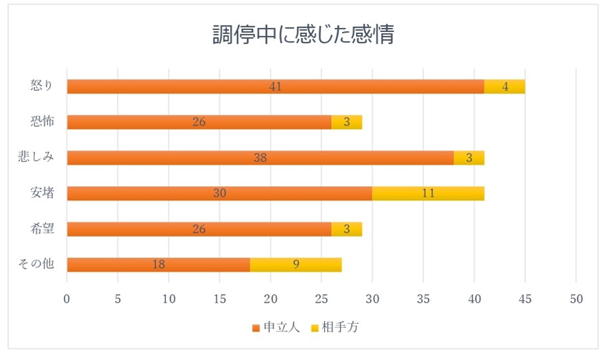 考察:相手方が「安堵」を感じた割合が高かったのはなぜでしょうか。協議に引っ張り出された立場ですが、相手方にも不満や不安があり、それについて話し合うことができたからでしょうか。一方、申立人は、怒りを感じながらも、結論が出ることへの希望を感じていることが分かります。