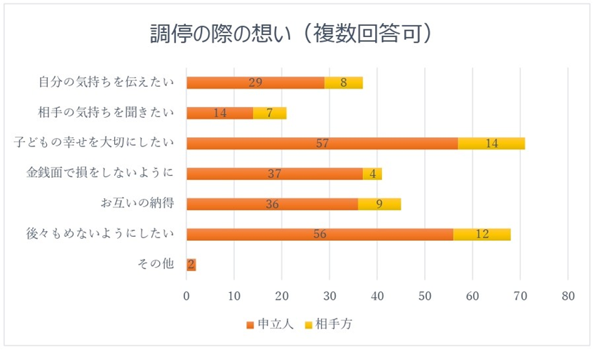 一方で、申立人・相手方共に、一番回答数が多いのが「子どもの幸せを大切にしたい。」、次に「後々もめないようにしたい」となっています。そのため、子どもの福祉の視点や禍根を将来に残したくないという思いは、同じ方向を向いて話し合う糸口になると思われます。