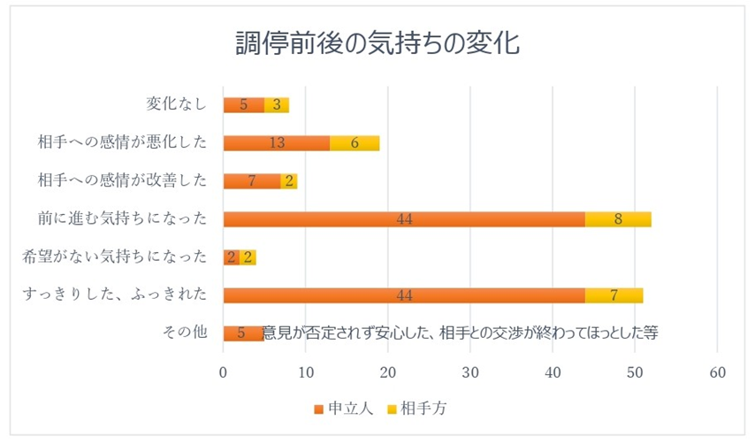 考察:申立人は、すっきりとふっきれた、前に進む気持ちになったという前向きな回答が多いのに比べ、相手方は「相手のへ感情が悪化した」という回答の割合が申立人に比べて多くなっています。協議のニーズや準備ができていない段階で話合いの場に出ざるを得なかったことが原因でしょうか。一方で、相手方も、申し立てられた立場ではあるものの、すっきりふっきれた、前に進む気持ちになったという人の割合も大きくなっています。
